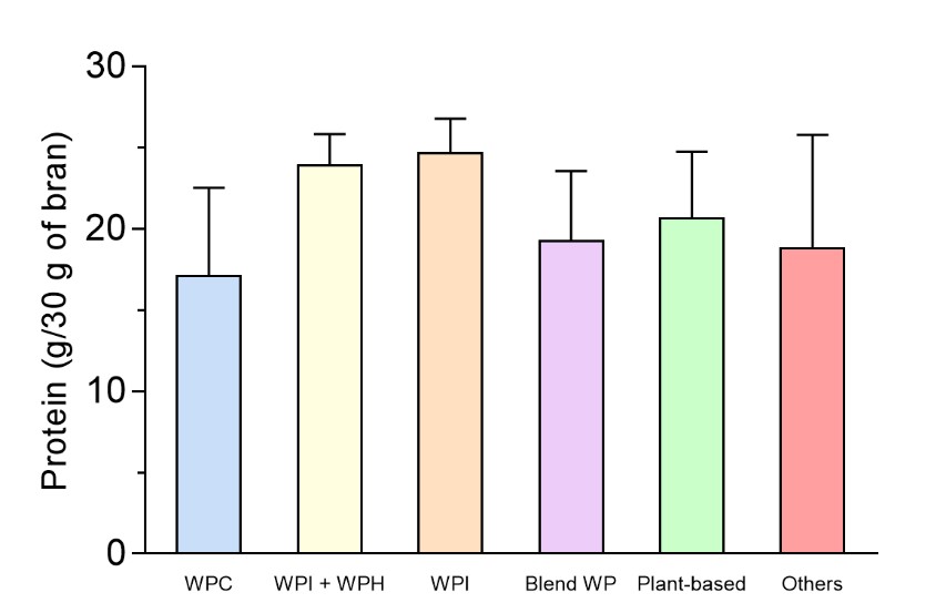 O consumo de suplementos proteicos faz cada vez mais parte do cotidiano dos adultos em geral e está associado a um estilo de vida mais saudável. Porém, o constante descomprometimento com a qualidade desses produtos por parte das empresas, porém, traz riscos à saúde dos consumidores. Este estudo, portanto, tem como objetivo analisar o teor de proteína e compará-lo com a rotulagem nutricional de diferentes suplementos proteicos. Esta é uma investigação analítica original. Verificou-se se os suplementos alimentares cumprem o rótulo apresentado por meio da análise dos alimentos (método Kjeldahl, teor de cinzas e percentagem de umidade) da composição de diversas marcas nacionais e internacionais (n=51). Foram analisados 51 diferentes suplementos à base de proteínas comercializados no Brasil. Os resultados mostraram que os valores proteicos divulgados no rótulo nutricional são semelhantes aos do produto (P-valor > 0,05) e estão dentro do limite de tolerância de 20% conforme legislação vigente. Além disso, existem semelhanças entre os diferentes tipos de produtos (P-valor > 0,05) quanto ao teor de cinzas e água. Concluindo, as informações nutricionais dos suplementos proteicos refletem a realidade do farelo desses produtos.