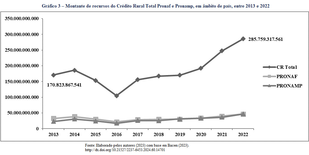 O objetivo deste estudo foi analisar a distribuição dos recursos de crédito rural entre as Unidades da Federação no período de 2013 a 2022. Para isso, foram analisados estatisticamente dados relacionados ao número de contratos, montante acessado e distribuição do acesso no território brasileiro quanto ao Crédito Rural Total, Pronaf e Pronamp. As informações foram obtidas por meio da Matriz de Crédito Rural do Banco Central do Brasil para o período em análise, em que a variável dos valores financeiros foi deflacionada pelo Índice Nacional de Preços ao Consumidor (INPC) anual do Instituto Brasileiro de Geografia e Estatística (IBGE), os quais representam os valores constantes para o ano de 2022. Como resultados, observou-se um cenário de aumento significativo do montante de crédito rural em alguns anos do período analisado, ao mesmo tempo em que persistiu a distribuição de crédito rural desigual entre as Unidades da Federação. O total de contratos no período foi superior a 20,9 milhões, o montante financeiro ultrapassou R$ 1,8 trilhão e valor médio dos contratos do crédito rural total passou de R$ 61 mil em 2013 para, aproximadamente, R$ 149 mil no ano de 2022. É inegável a contribuição do crédito para o desenvolvimento rural, como também é urgente repensar políticas públicas de crédito, especialmente quanto à cobertura geográfica e formas de aplicação para a efetiva promoção do sustentável no país.