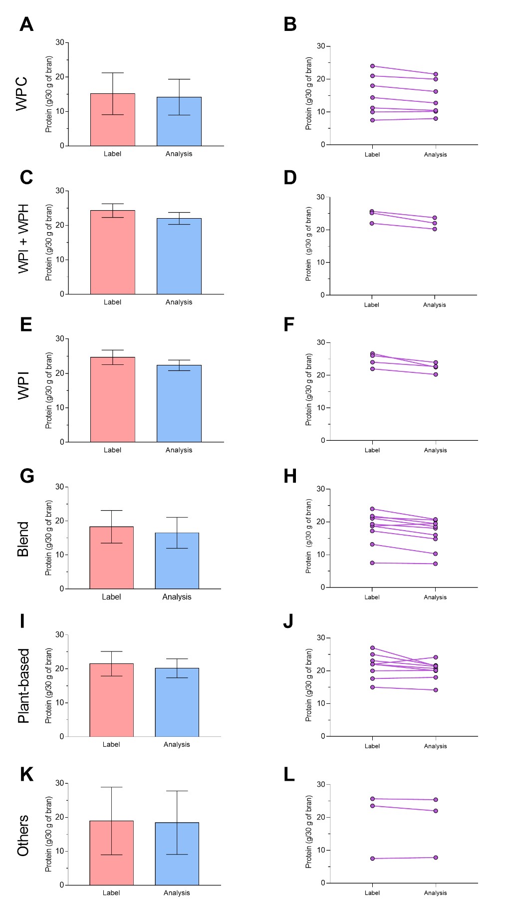 O consumo de suplementos proteicos faz cada vez mais parte do cotidiano dos adultos em geral e está associado a um estilo de vida mais saudável. Porém, o constante descomprometimento com a qualidade desses produtos por parte das empresas, porém, traz riscos à saúde dos consumidores. Este estudo, portanto, tem como objetivo analisar o teor de proteína e compará-lo com a rotulagem nutricional de diferentes suplementos proteicos. Esta é uma investigação analítica original. Verificou-se se os suplementos alimentares cumprem o rótulo apresentado por meio da análise dos alimentos (método Kjeldahl, teor de cinzas e percentagem de umidade) da composição de diversas marcas nacionais e internacionais (n=51). Foram analisados 51 diferentes suplementos à base de proteínas comercializados no Brasil. Os resultados mostraram que os valores proteicos divulgados no rótulo nutricional são semelhantes aos do produto (P-valor > 0,05) e estão dentro do limite de tolerância de 20% conforme legislação vigente. Além disso, existem semelhanças entre os diferentes tipos de produtos (P-valor > 0,05) quanto ao teor de cinzas e água. Concluindo, as informações nutricionais dos suplementos proteicos refletem a realidade do farelo desses produtos.