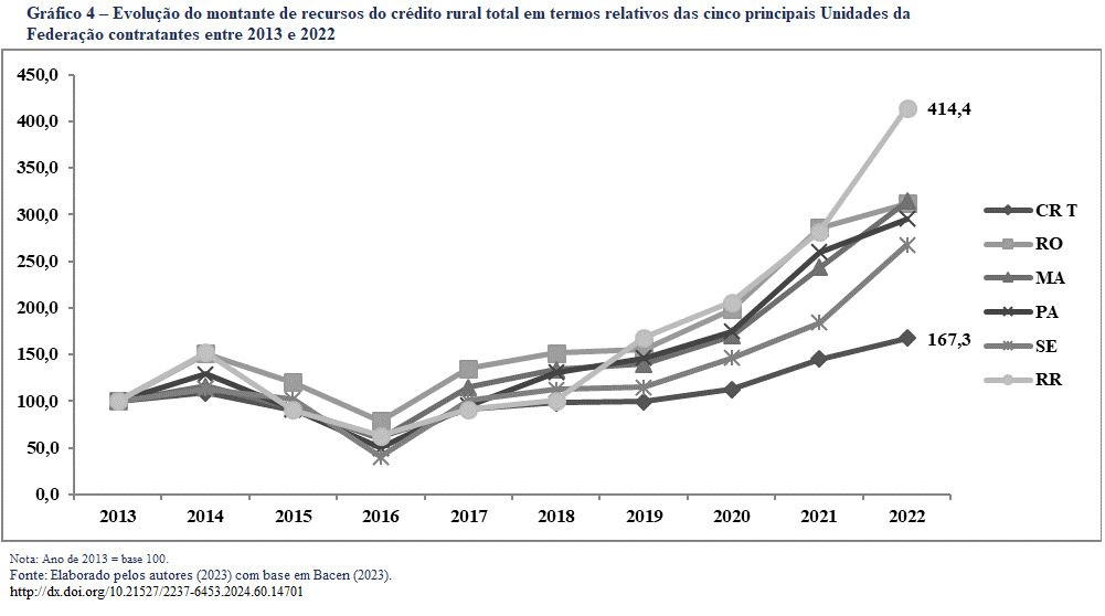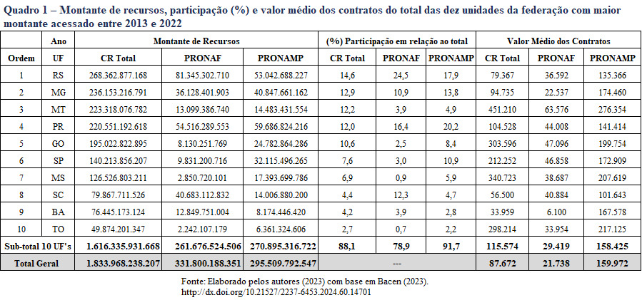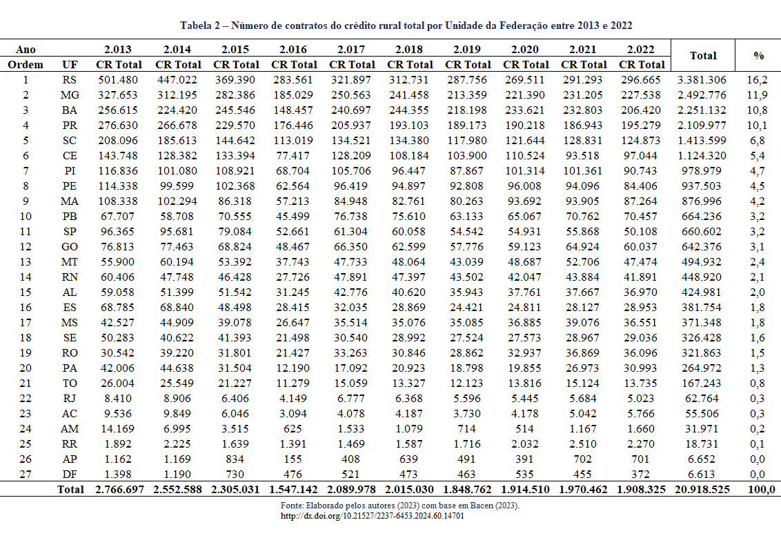O objetivo deste estudo foi analisar a distribuição dos recursos de crédito rural entre as Unidades da Federação no período de 2013 a 2022. Para isso, foram analisados estatisticamente dados relacionados ao número de contratos, montante acessado e distribuição do acesso no território brasileiro quanto ao Crédito Rural Total, Pronaf e Pronamp. As informações foram obtidas por meio da Matriz de Crédito Rural do Banco Central do Brasil para o período em análise, em que a variável dos valores financeiros foi deflacionada pelo Índice Nacional de Preços ao Consumidor (INPC) anual do Instituto Brasileiro de Geografia e Estatística (IBGE), os quais representam os valores constantes para o ano de 2022. Como resultados, observou-se um cenário de aumento significativo do montante de crédito rural em alguns anos do período analisado, ao mesmo tempo em que persistiu a distribuição de crédito rural desigual entre as Unidades da Federação. O total de contratos no período foi superior a 20,9 milhões, o montante financeiro ultrapassou R$ 1,8 trilhão e valor médio dos contratos do crédito rural total passou de R$ 61 mil em 2013 para, aproximadamente, R$ 149 mil no ano de 2022. É inegável a contribuição do crédito para o desenvolvimento rural, como também é urgente repensar políticas públicas de crédito, especialmente quanto à cobertura geográfica e formas de aplicação para a efetiva promoção do sustentável no país.